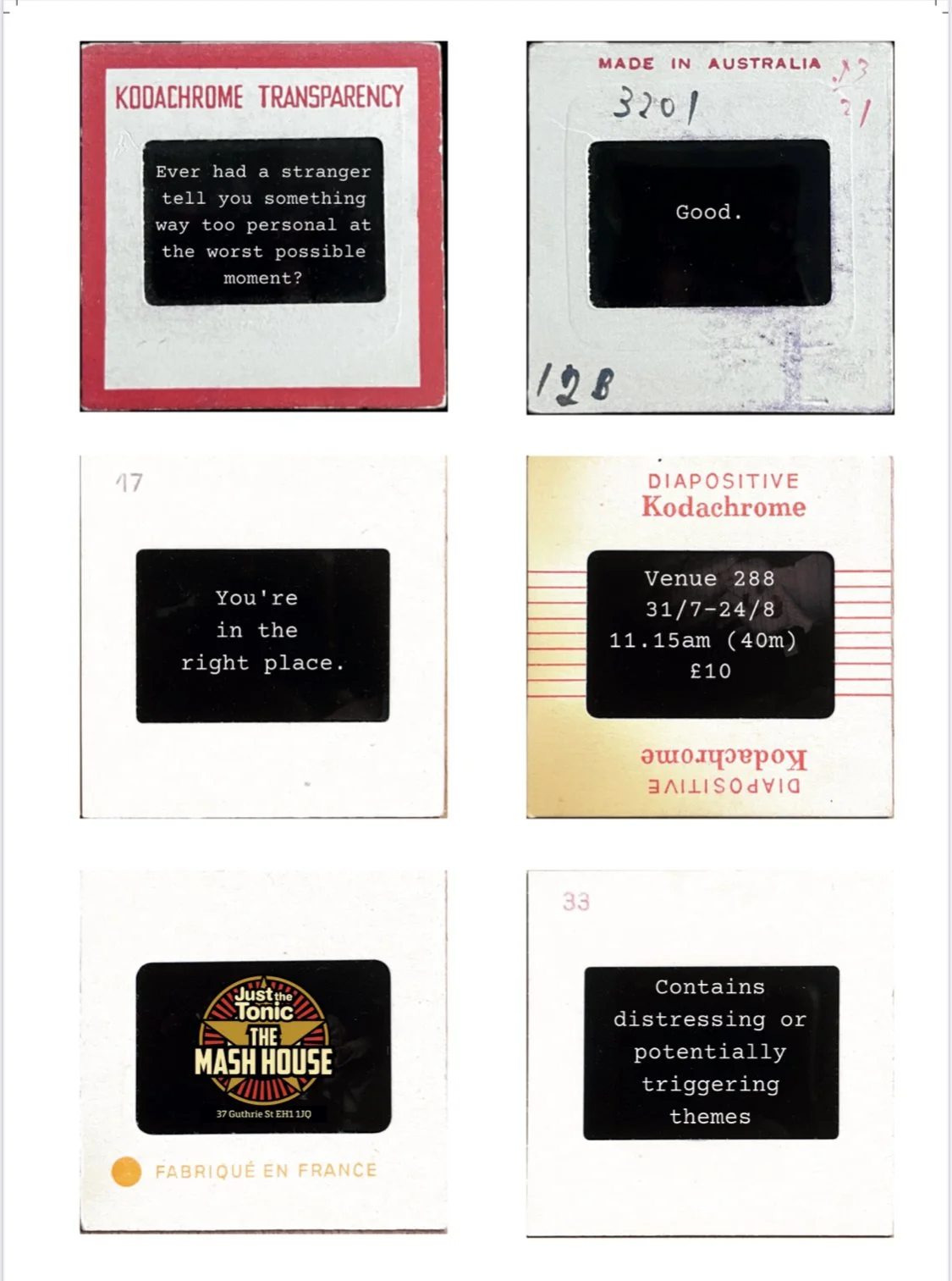 FAMILIAR STRANGERS is a darkly funny, tender storytelling show with a slide projector.